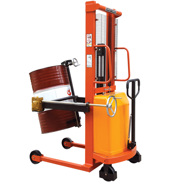 Бочкокантователи с электроподъемом DSE 350/XX в свою очередь являются аналогами штабелеров с электроподъемом. Подъем бочки на определенную высоту осуществляется с помощью электрогидравлического привода мощностью 1,6 кВт, который питается от аккумулятора емкостью 120 А/ч. В стандартной комплектации бочкокантователи DSE также комплектуются механическим червячным редуктором, но также возможна установка электрического поворотного механизма бочки.