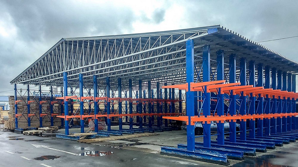 - Применение разных систем хранения. Самонесущий склад возможно возвести на паллетных, консольных стеллажах, мезонине